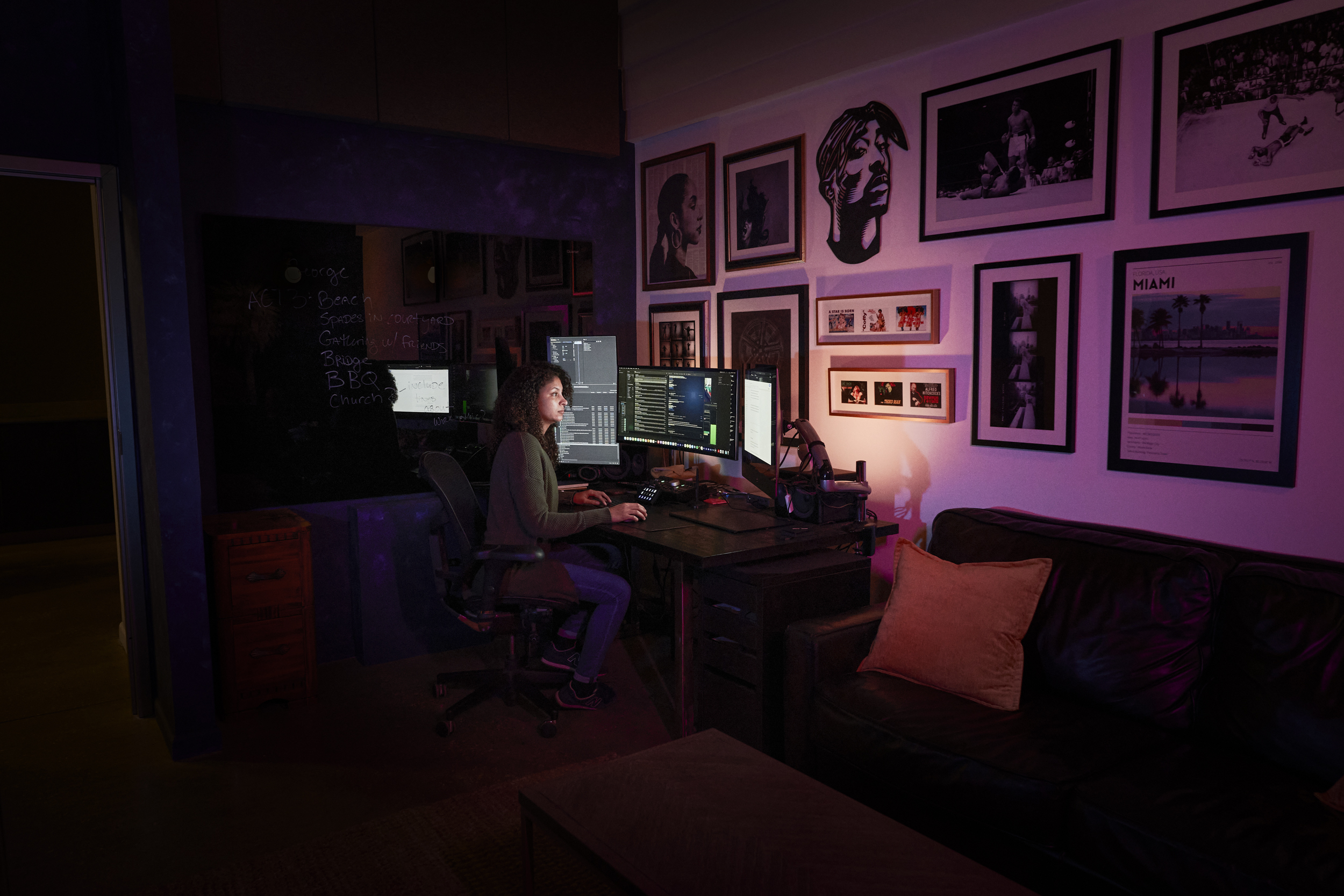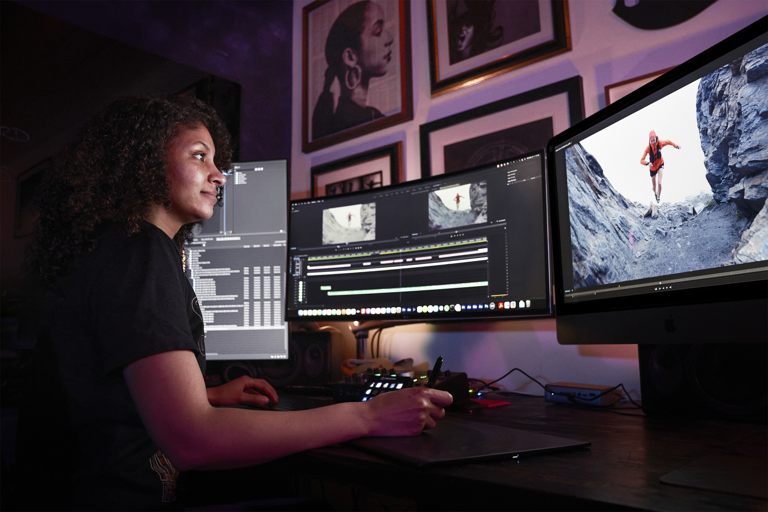 With so many environments in this film, sound design played a huge role in immersing the viewer in each unique world. From mountain tops to lakeside runs, every texture demands attention. Along with that, the time-jumping provided opportunities to cue transitions not just with the screen but with speakers. Early and often interacting with the cut and approach is key. Edit suite across the hall from the audio suite